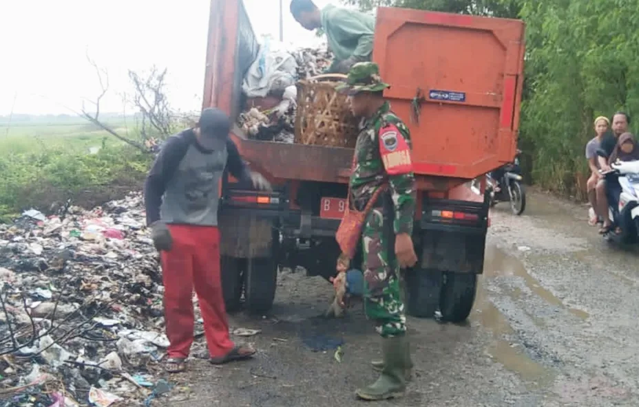 Bekasi Tambun – Akibat Masih Banyaknya Pembungaan Sampah Liar, Sertu Erick Budiman dan Serda Indra Yudha Babinsa Koramil 01 Tambun Bersama Dinas Lingkungan hidup Berjibaku Membersihkan Tumpukan Sampah Di Kampung Sasak Tiga RT 004/04 Desa Tridayasakti Kecamatan Tambun Selatan, Kabupaten Bekasi, Selasa 23/4/2024.