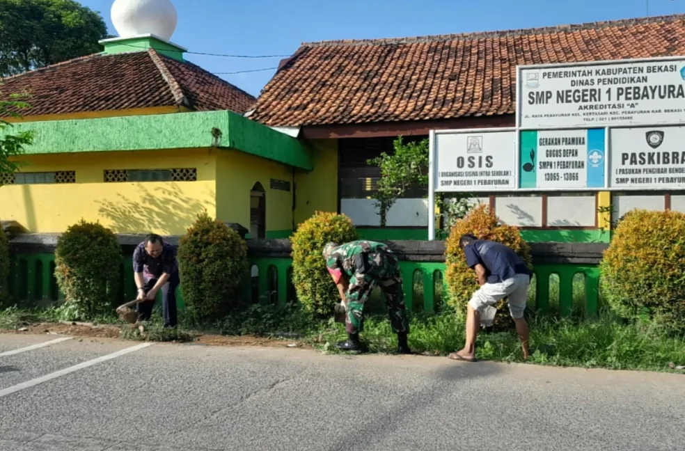 Bekasi Pebayuran – Dalam rangka mendukung kegiatan Jumat Bersih, serta mendukung kebersihan lingkungan sekolah Anggota Koramil 11 Pebayuran Peltu Dadang bersama warga membersihkan Lingkungan sekolah SMPN 1 Pebayuran Kabupaten Bekasi, Jumat 26/4/2024.