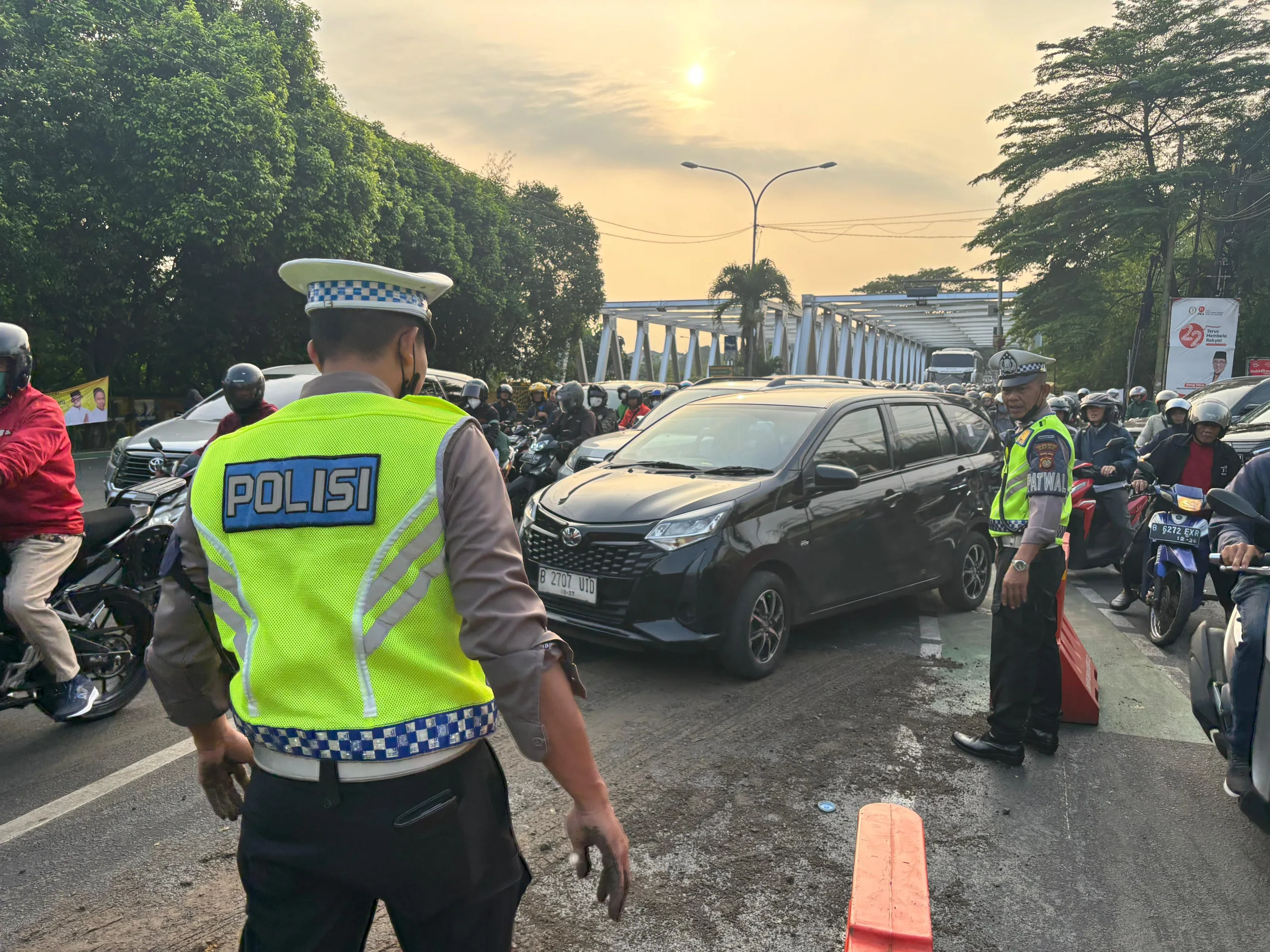 Depok – Anggota Satuan Lalu Lintas (Sat Lantas) Polres Metro Depok turun ke lapangan untuk membersihkan tumpahan oli yang mengancam keselamatan pengendara di Jalan Juanda, Depok.
