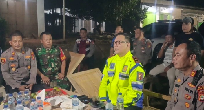 Kasat Lantas Polres Metro Bekasi Kompol Nopta Istaris Sujan, menyambangi Pos Kamling Kampung Leungsir, Desa Jayasampurna, Kecamatan Serang Baru, Kabupaten Bekasi.