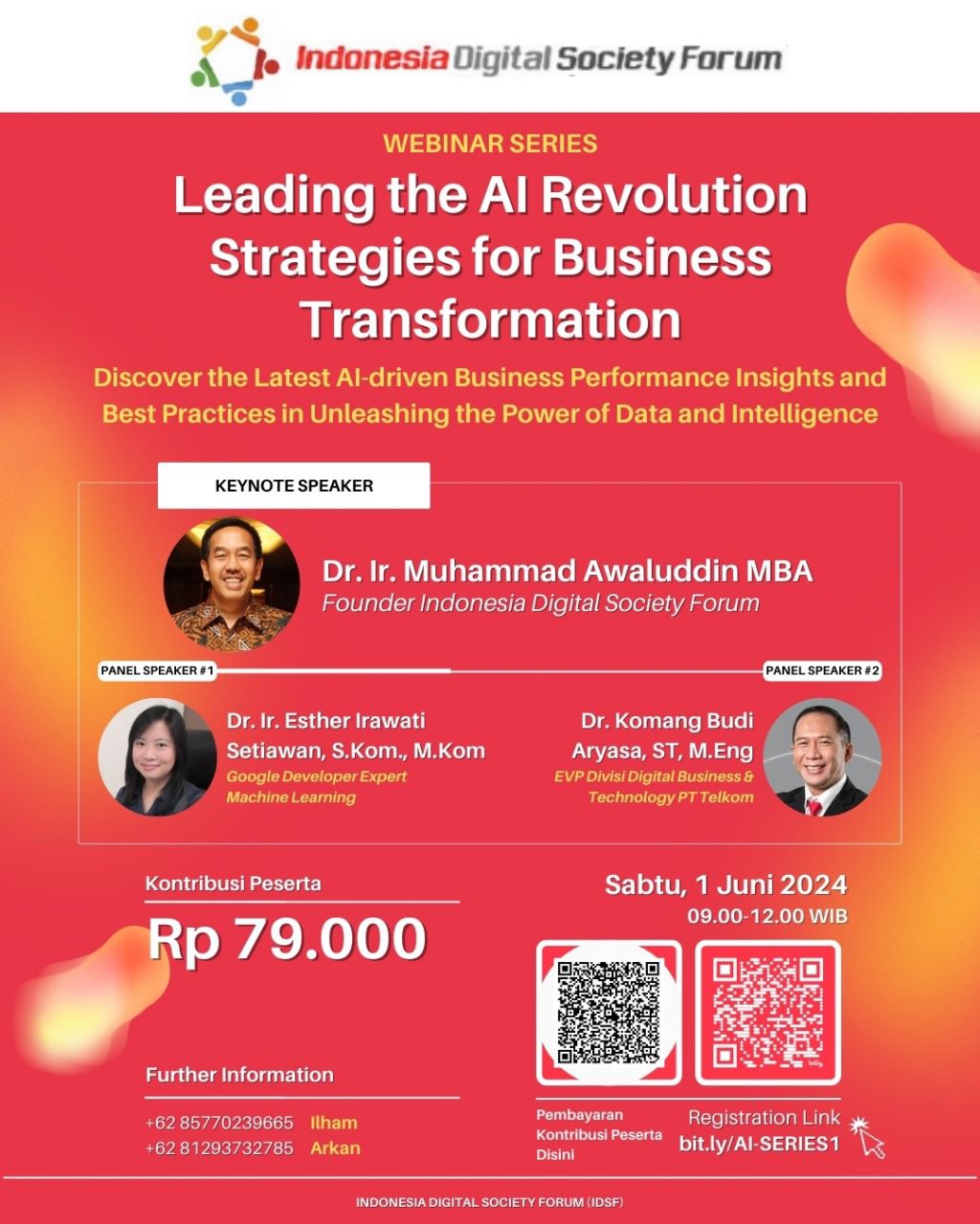 Webinar series pertama yang digelar IDSF dengan tema “Leading the AI Revolution: Strategies for Business Transformation” digelar pada Sabtu, 1 Juni 2024, pada pukul 09.00-12.00 WIB dan dapat diikuti oleh seluruh masyarakat dengan melakukan registrasi melalui link bit.ly/AI-SERIES1.(Red)