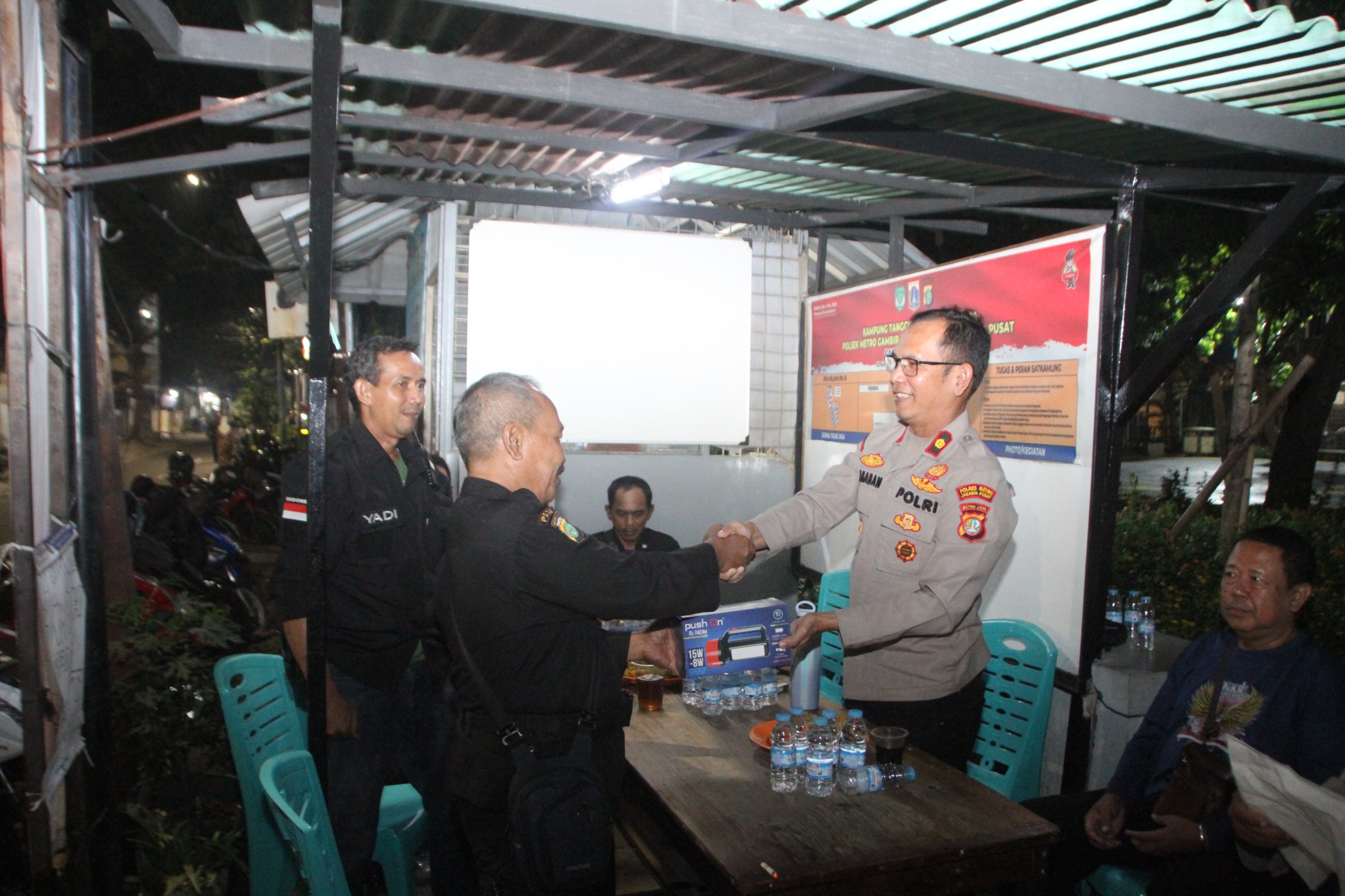 Menyampaikan amanat Kapolres Metro Jakarta Pusat Kombes Pol Susatyo Purnomo Condro, Kapolsek Metro Gambie memberikan cendera mata berupa perlengkapan untuk petugas Satkamling berpatroli.