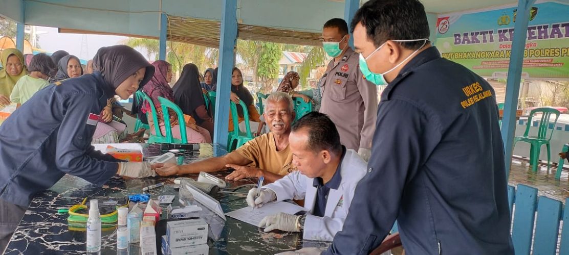 PELALAWAN – Memeriahkan Hari Ulang Tahun Bhayangkara ke-78 Tahun 2024, Polres Pelalawan gelar bakti kesehatan pengobatan umum kepada masyarakat petani dan nelayan.