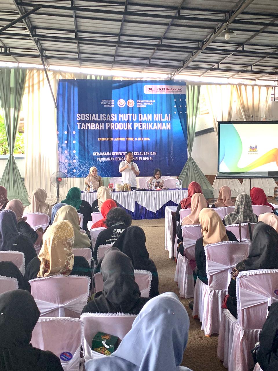 Lampung Timur || HSB – Anggota DPR RI Hanan A. Rozak bersama Direktorat Jenderal (Dirjen) Penguatan Daya Saing Produk Kelautan dan Perikanan, Kementerian Kelautan dan Perikanan (KKP) RI melakukan kerjasama dengan menggelar Bimbingan Teknis (Bimtek) dan sosialisasi Mutu dan Nilai Tambah Produk Perikanan, yang dipusatkan di, Kecamatan Sekampung, Kabupaten Lampung Timur, pada Senin (8/7/2024).