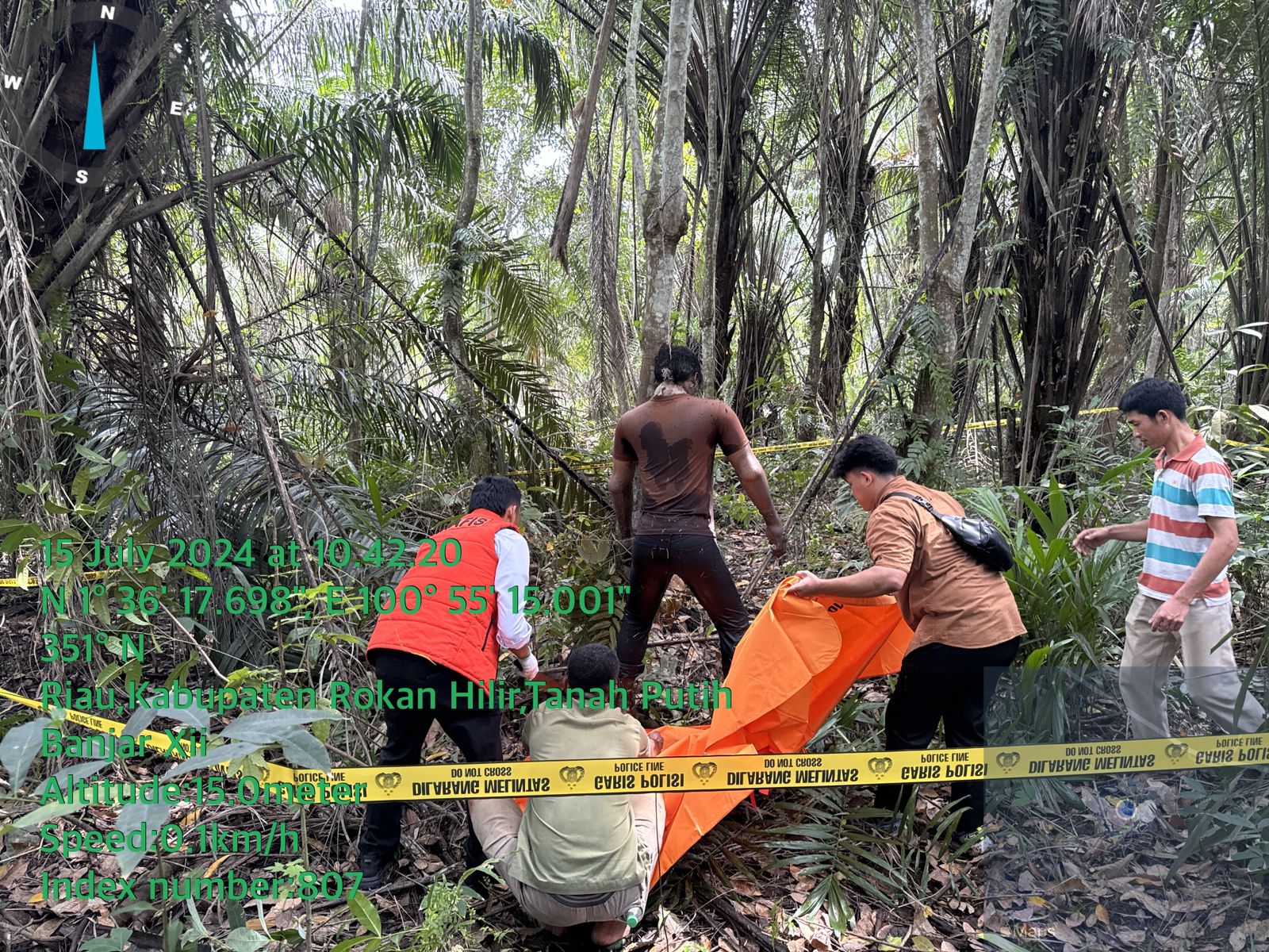 ROHIL – Tim Gabungan Polres Rohil dan Polsek Tanah Putih lakukan evakuasi terhadap sesosok mayat ditemukan di Menggala Jungction RT 19/RW 04 Kelurahan Banjar XII Kecamatan Tanah Putih, Senin (15/7).