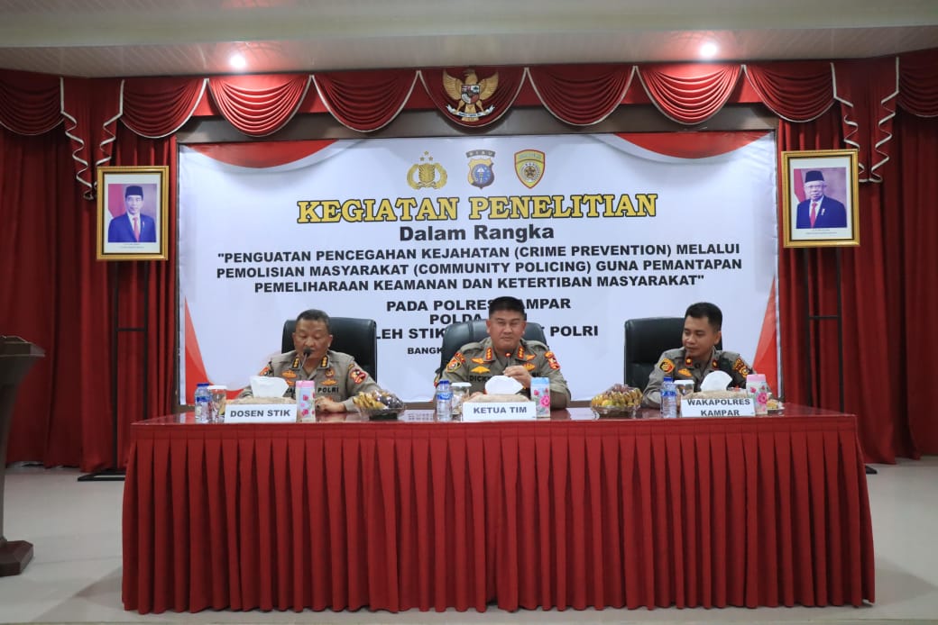 KAMPAR – STIK lemdiklat Polri melaksanakan penelitian dengan judul Penguatan pencegahan kejahatan (Crime Prevention) melalui pemolisian masyarakat (Comunnity Policing) guna pemantapan pemeliharaan keamanan dan ketertiban masyarakat di Polres Kampar, Rabu (31/7/2024) sekira pukul 09.30 WIB.