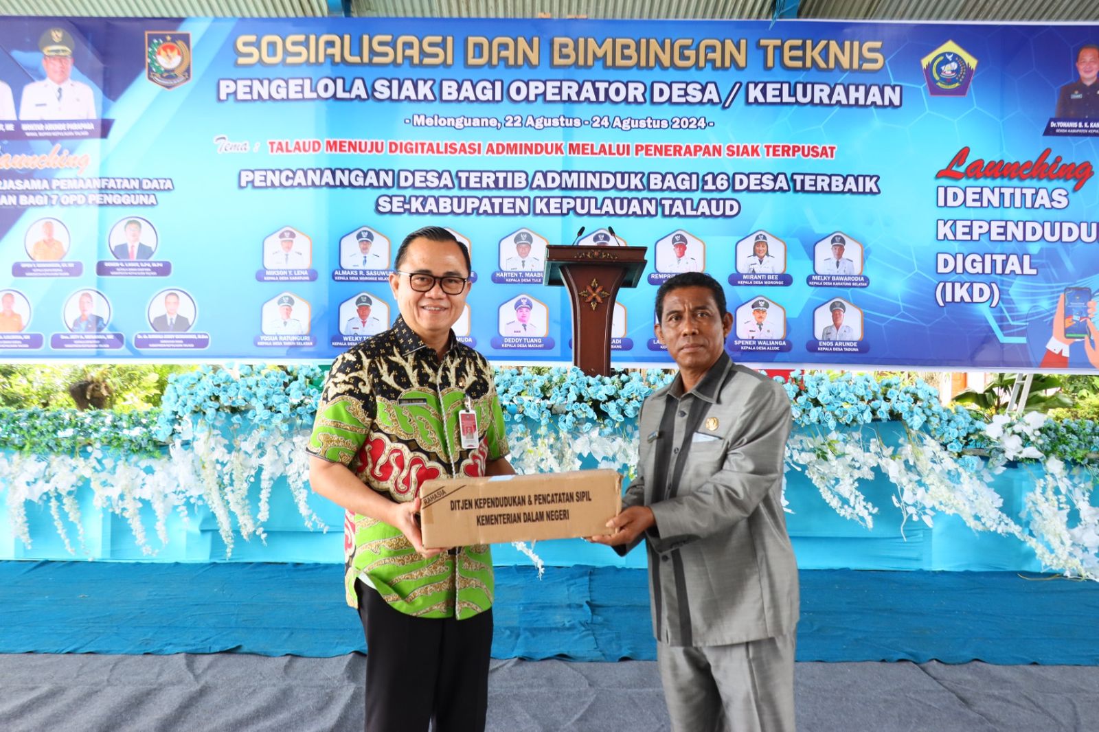 Kegiatan sosialisasi dan bimbingan teknis pengelolaan SIAK bagi operator desa/kelurahan se-Kabupaten Talaud mengangkat tema “Talaud Menuju Digitalisasi Adminduk Melalui Penerapan SIAK Terpusat”. Kegiatan ini dirangkai dengan pelayanan dokumen kependudukan, launching perjanjian kerja sama pemanfaatan data kependudukan bagi 7 OPD pengguna, pencanangan desa tertib Adminduk 16 desa terbaik, dan launching Identitas Kependudukan Digital (IKD).