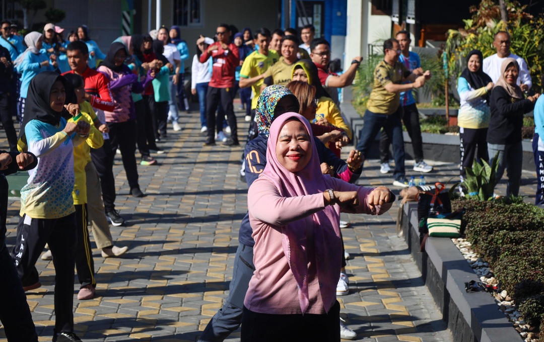 Kepala Lapas Perempuan Bandung Yekti Apriyanti tampak bersemangat berada di barisan depan, ikut memimpin jalannya senam dengan penuh antusiasme.
