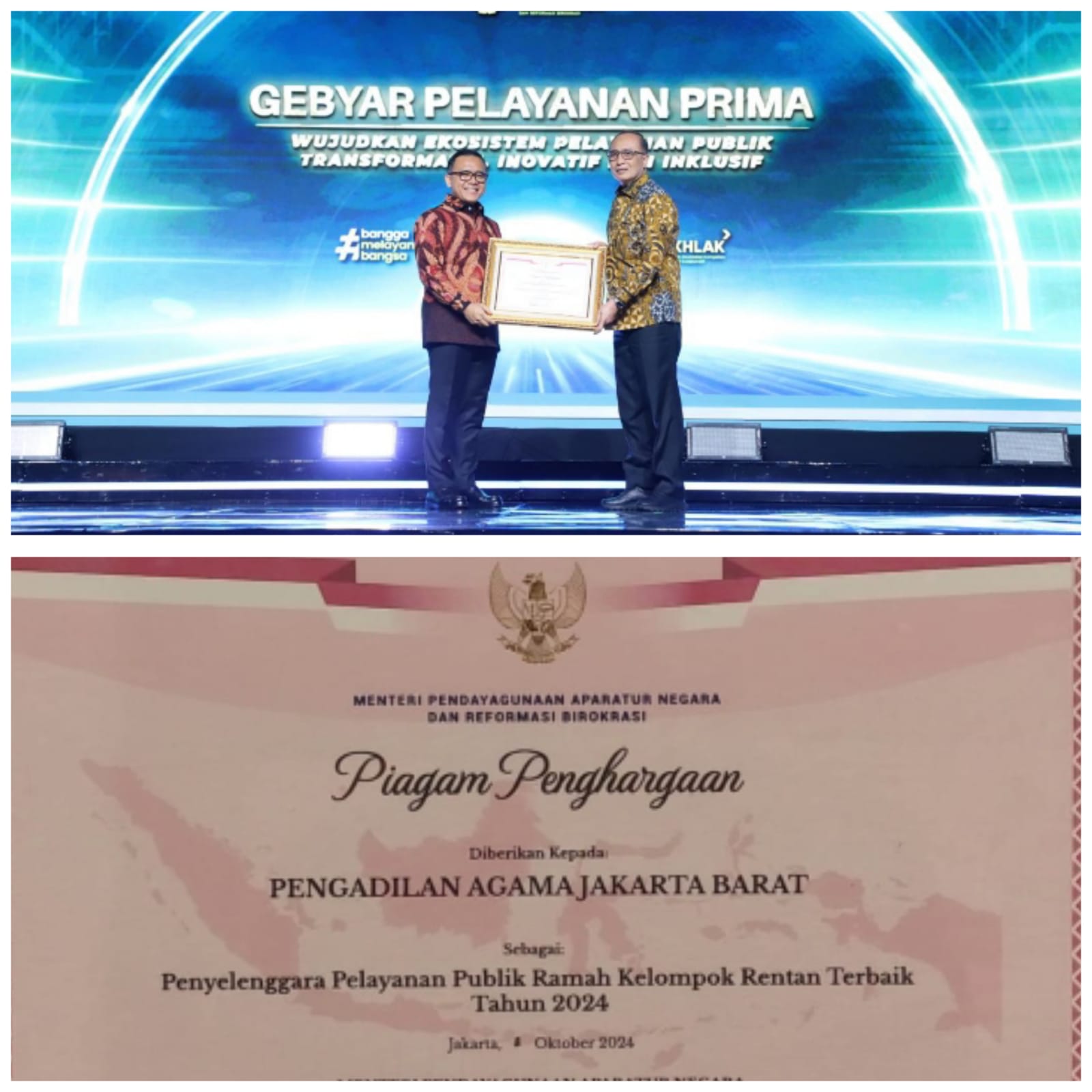 Jakarta | HSB – Mahkamah Agung dalam hal ini, Satuan Kerja Pengadilan Agama Jakarta Barat meraih penghargaan unit penyelenggara pelayanan publik yaitu kategori pembinaan pelayanan publik ramah kelompok rentan dari Kementerian Pendayagunaan Aparatur Negara dan Reformasi Birokrasi (PANRB) dalam acara Gebyar Pelayanan Prima di Jakarta, Selasa (08/10).