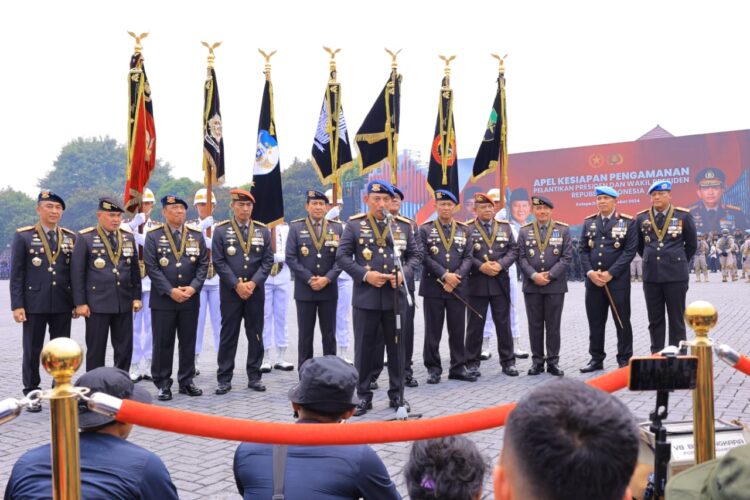 Penganugeraan medali kehormatan dilakukan saat apel gelar pasukan pengamanan pengambilan sumpah Presiden dan Wakil Presiden terpilih di Mako Brimob Kelapa Dua, Depok, Jawa Barat, Senin (14/10/2024).