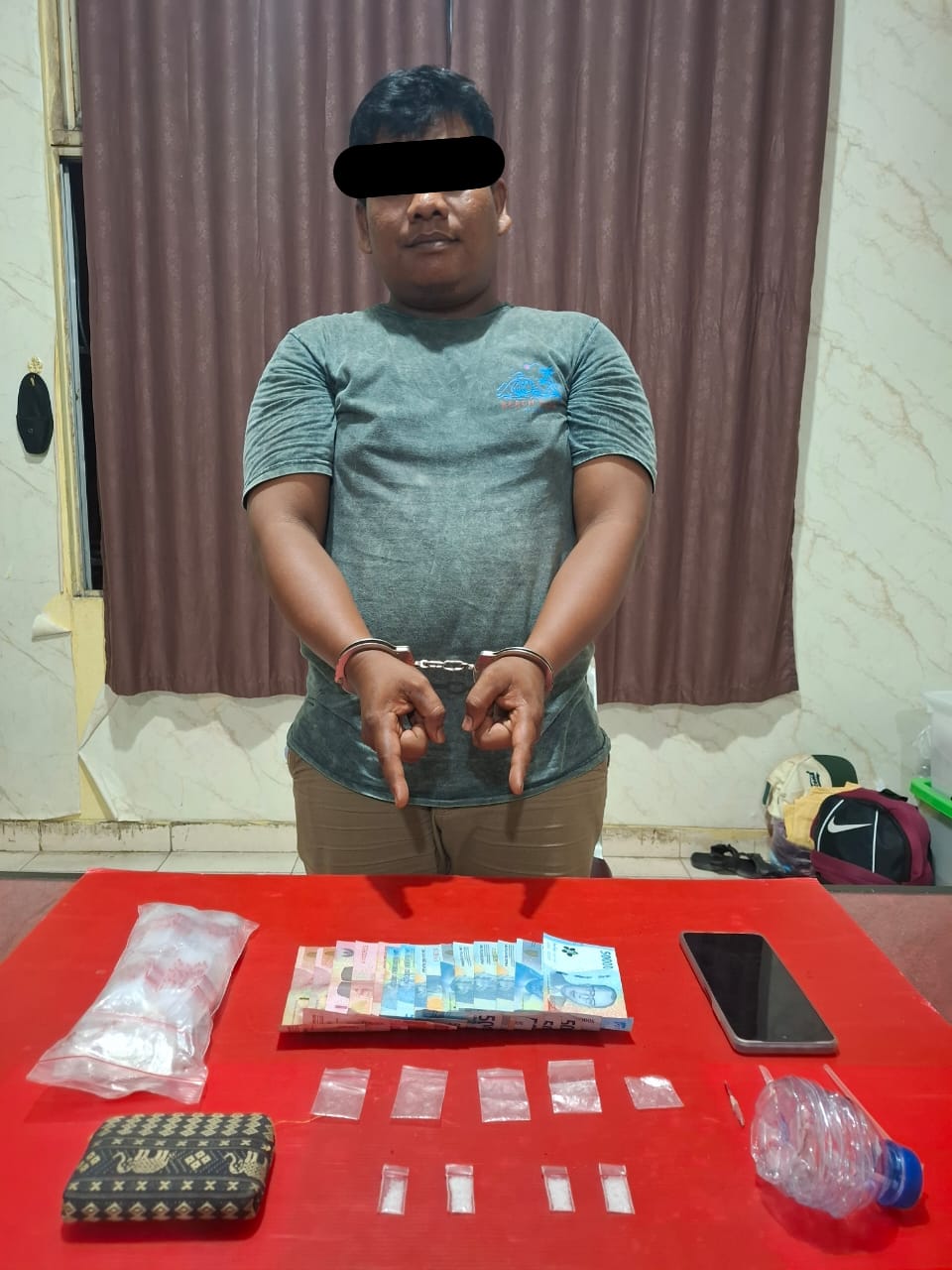Saat dilakukan penggeledahan, petugas menemukan barang bukti berupa 4 paket plastik klip bening yang diduga berisi narkotika jenis shabu di dalam dompet motif batik yang berada di kantong celana depan tersangka. Barang bukti lain yang turut disita antara lain satu buah alat hisap bong, 5 plastik klip kosong ukuran sedang, satu bal besar plastik klip kosong, satu sendok plastik, satu unit handphone Oppo A60 warna hitam, uang tunai sebesar Rp 1.000.000, dan satu unit sepeda motor merk Honda ADV warna hitam yang digunakan tersangka dalam menjalankan aksinya.