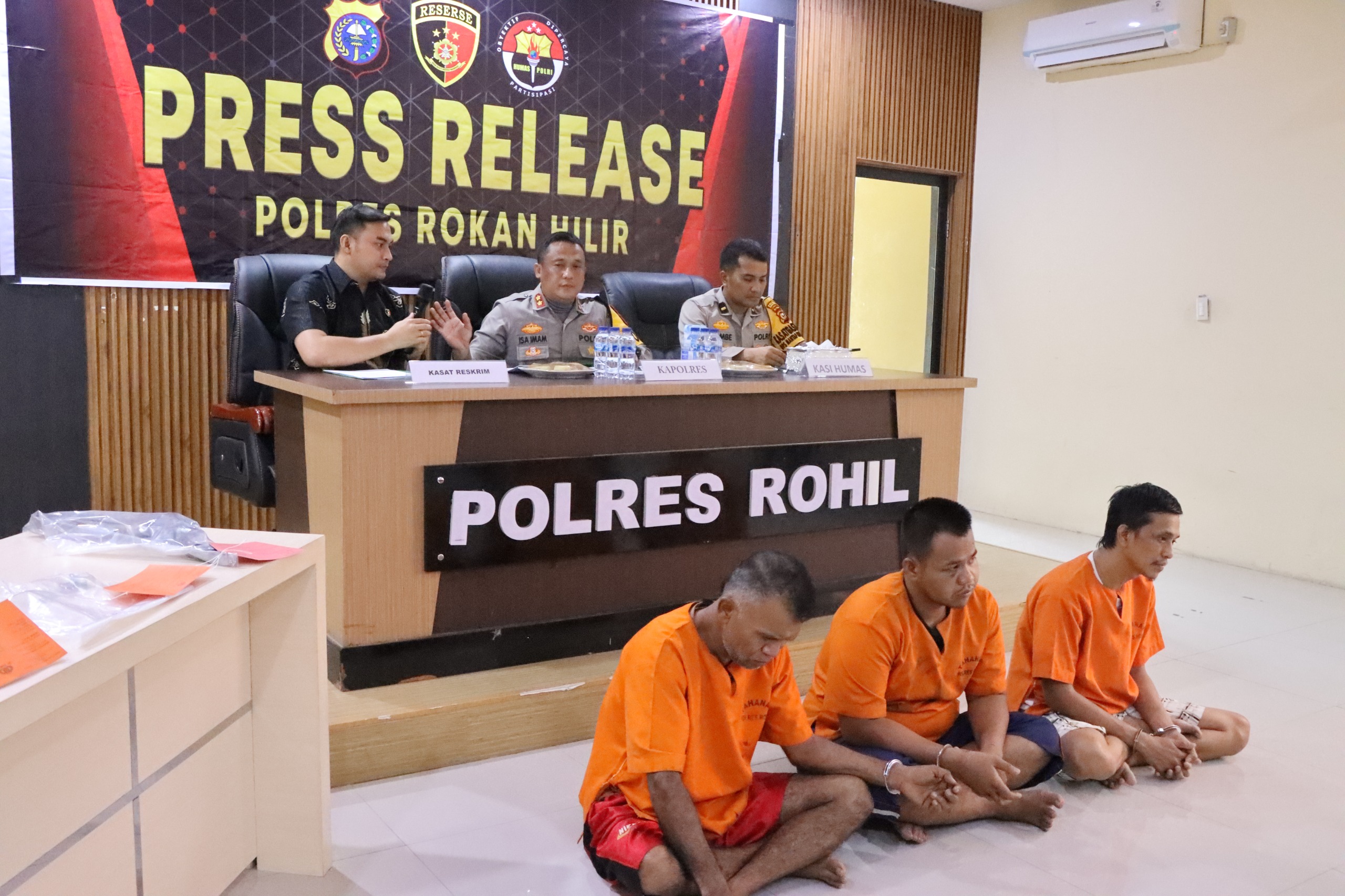 Rohil | HSB – Kapolres Rohil AKBP Isa Imam Syahroni, S.I.K M.H. Didampingi Kasat Reskrim Polres Rohil AKP AKP I Putu Adi Juniwinata, S.Tr.K., S.I.K., M.Si, Kanit II Sat Reskrim Polres Rohil Iptu Ridho Alfian Syahputra S.TrK dan Plh Kasi Humas Polres Rohil Ipda Fahrudin Ahmadi Rambe, S.Pd. dan Personel, menggelar Press release bertempat di Ruang Aula Patriatama Polres Rohil, Jum’at 1 Nopember 2024. Pukul 13: 30 WIB.