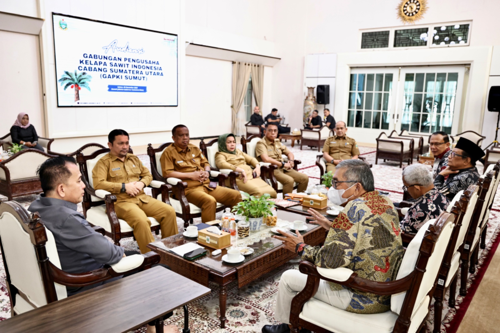 Medan | HSB – Penjabat (Pj) Gubernur Sumatera Utara (Sumut) Agus Fatoni bersama Gabungan Pengusaha Kelapa Sawit Indonesia (GAPKI) Sumut membahas berbagai isu terkini pada sektor sawit. Di antaranya terkait program Peremajaan Sawit Rakyat (PSR), Dana Bagi Hasil (DBH) sawit, tenaga kerja, produksi sawit, hingga keamanan investasi di sektor perkebunan kelapa sawit di Sumut.