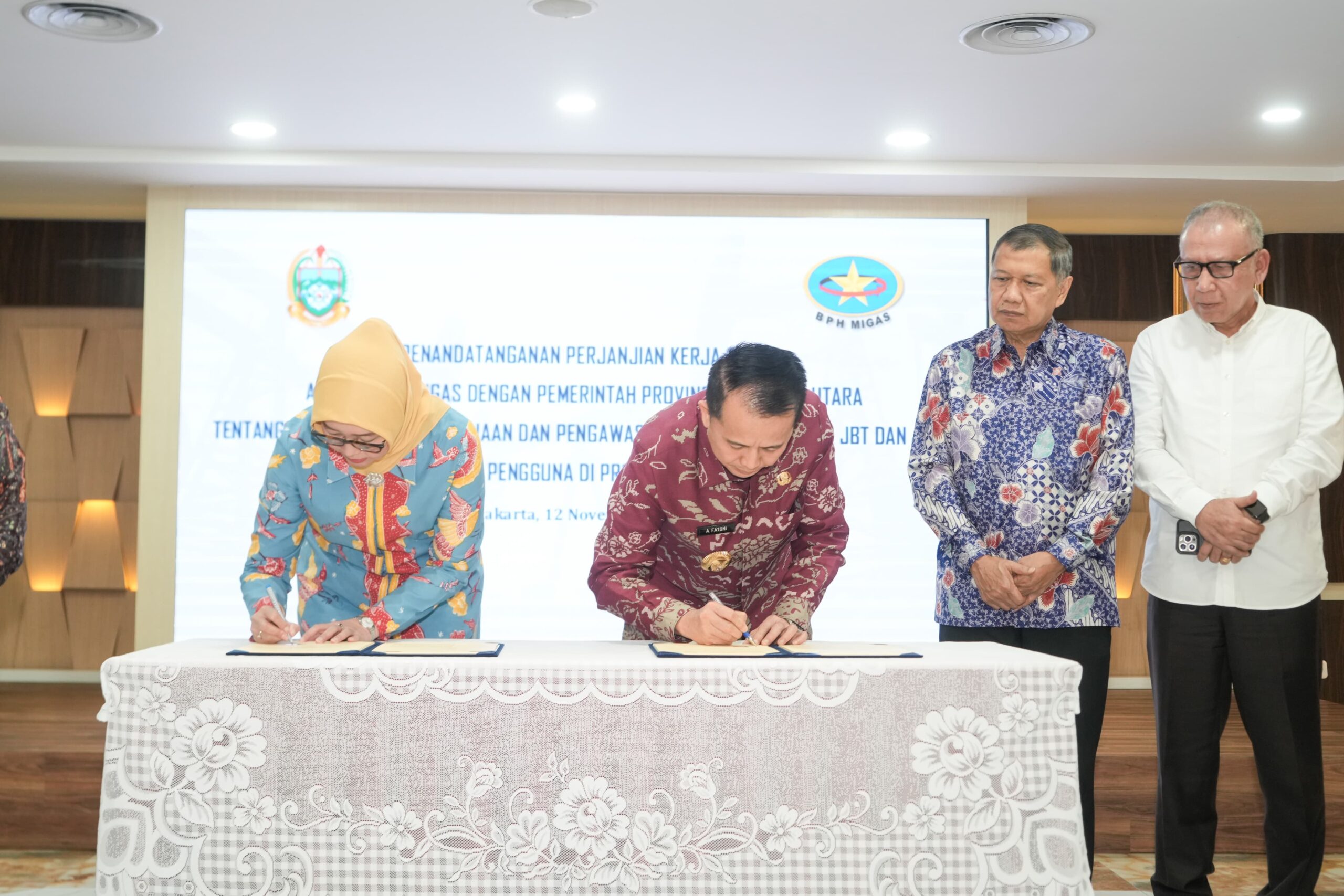 Jakarta | HSB – Penjabat (Pj) Gubernur Sumatera Utara (Sumut) Agus Fatoni dan Kepala Badan Pengatur Hilir Minyak dan Gas Bumi (BPH Migas) Erika Retnowati menandatangani Perjanjian Kerja Sama (PKS) Pengendalian, Pembinaan, dan Pengawasan dalam Penyaluran Jenis Bahan Bakar Minyak (BBM) Tertentu (JBT) Solar dan Jenis BBM Khusus Penugasan (JBKP) Pertalite. Kegiatan ini berlangsung di Kantor BPH Migas, Jakarta, Selasa (12/11/2024).