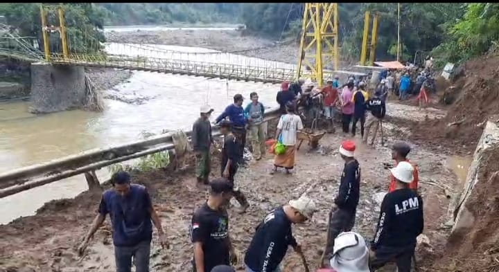 Kades Tarisi Bersama Perangkatnya Bantu Bersihkan Material Yang Menutupi Akses Jalan Kabupaten Ruas Warung-Mekarjaya