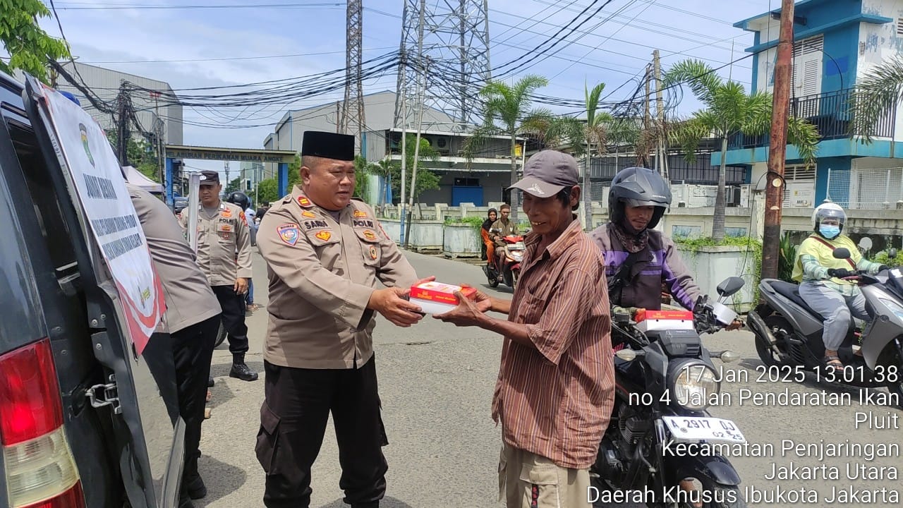 Jakarta | HSB – Upaya menjaga Kamtibmas dan Cooling System Pilkada, Kapolsubsektor Muara Angke Iptu Sardi bersama Kanitbinmas Polsek Kawasan Sunda Kelapa AKP Aji Mulyanto, S.H., dengan didampingi Panitbinmas Iptu Mashudi serta Bhabinkamtibmas Aiptu Agus Subekti, menggelar Jumat Berkah dengan membagikan Makanan dan Minuman siap saji kepada masyarakat, Nelayan, pekerja, petugas kebersihan, ojeg sepeda motor, sopir di Pelabuhan Muara Angke dengan menyampaikan himbauan kepada masyarakat Pelabuhan Muara Angke untuk bersama-sama menjaga situasi kondusif dalam Pilkada yang sudah masuk tahap penetapan Cagub-Cawagub terpilih. Langkah ini merupakan bagian dari upaya colling system untuk memastikan keamanan dan ketertiban masyarakat (kamtibmas) tetap terjaga setelah pelaksanaan pesta demokrasi dalam Pilkada, Jumat (17/1/2025).
