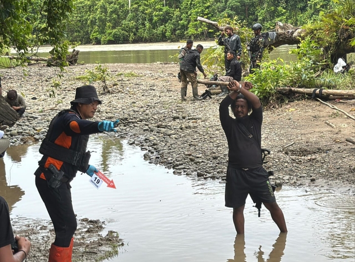 4. Rekonstruksi kejadian dengan pengecekan pada lokasi-lokasi yang sebelumnya menjadi area kegiatan Iptu Tomi dan timnya dalam upaya pencarian kelompok kriminal bersenjata (KKB).