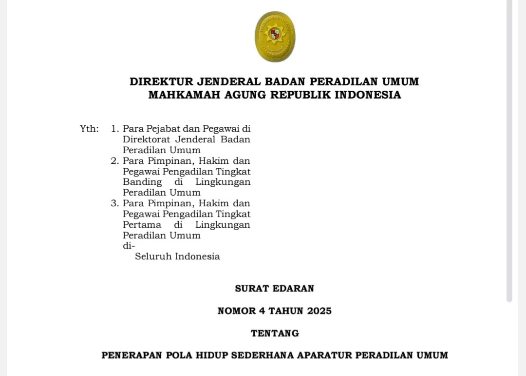 Jakarta | HSB – Direktur Jenderal Badan Peradilan Umum (Dirjen Badilum) baru saja menerbitkan Surat Edaran No. 4 Tahun 2025 mengenai penerapan pola hidup sederhana Aparatur Peradilan Umum. Surat Edaran tersebut ditandatangani pada tanggal 15 Maret 2025.