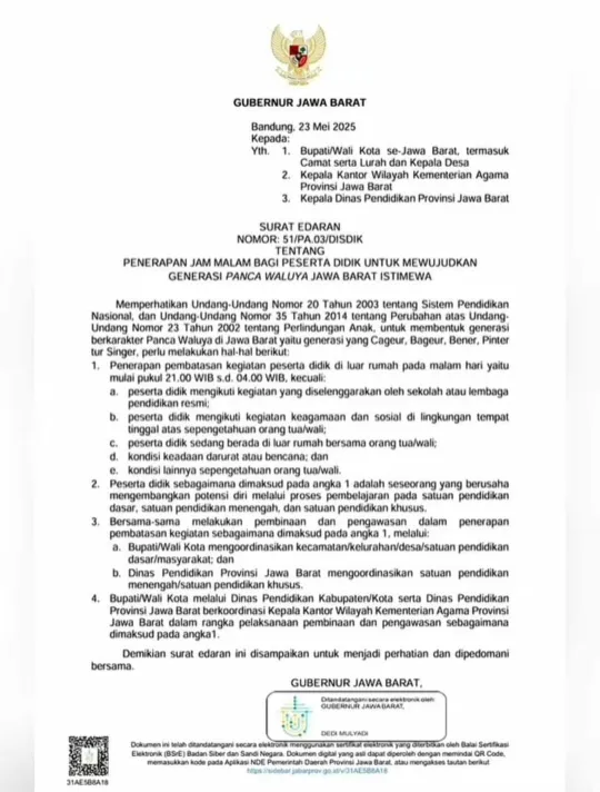 “Kami akan prioritaskan pendekatan edukasi terlebih dahulu melalui kampanye Jawa Barat Peduli Generasi,” tegas Gubernur Dedi Mulyadi dalam surat edaran resmi yang telah ditandatangani secara digital.