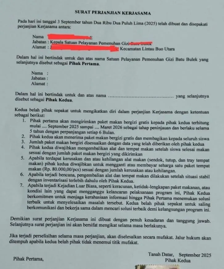Dokumen bertanggal 10 September 2025 itu disebut sebagai perjanjian kerja sama antara Kepala Satuan Pelayanan Pemenuhan Gizi (SPPG) dengan penerima manfaat. Di bagian atas surat tercantum kop resmi Badan Gizi Nasional (BGN).