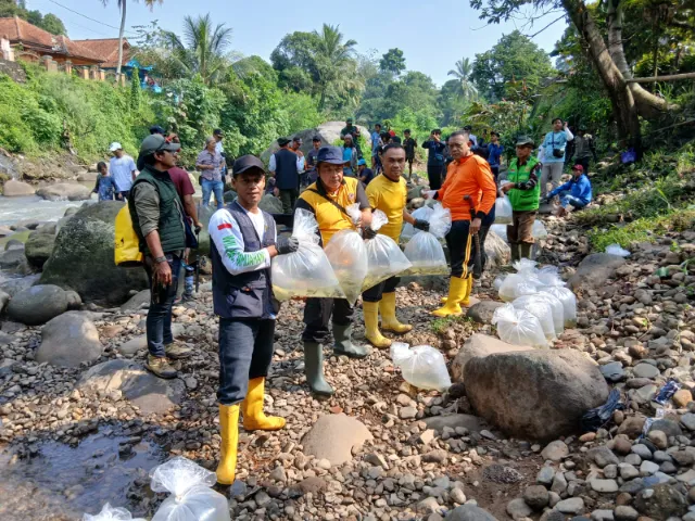 Bogor – Dalam rangka menjaga kelestarian ekosistem dan keanekaragaman hayati, Karang Taruna Kecamatan Pamijahan berkolaborasi dengan Muspika Kecamatan Pamijahan serta komunitas praktisi lingkungan melaksanakan kegiatan tebar benih ikan di Sungai Cigamea, Kampung Pasar Rebo, perbatasan Desa Pasarean dan Desa Pamijahan, Kabupaten Bogor, Sabtu (27/09/2025).