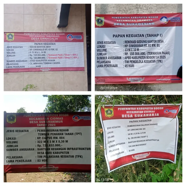 Bogor | HSB – Sejumlah proyek pembangunan desa di Kabupaten Bogor tahun anggaran 2025 memunculkan pertanyaan publik terkait kualitas pelaksanaannya. Dari pantauan HSB.com di beberapa lokasi seperti Desa Sirnagalih (Kecamatan Tamansari), Desa Sukawening (Kecamatan Dramaga), Desa Sukamakmur dan Desa Sukaharja (Kecamatan Ciomas), tidak satu pun papan kegiatan mencantumkan keberadaan konsultan perencana maupun konsultan pengawas. Rabu, (01/10/2025).