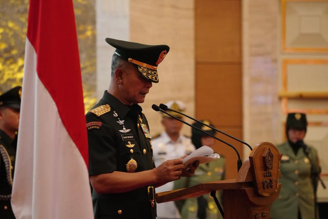 Jakarta (Puspen TNI). Kepala Staf Umum (Kasum) TNI Letjen TNI Richard Tampubolon mewakili Panglima TNI Jenderal TNI Agus Subiyanto memimpin upacara Serah Terima Jabatan (Sertijab) Asisten Intelijen (Asintel) Panglima TNI dari Mayjen TNI Krido Pramono, S.H., M.Si., kepada Mayjen TNI Rio Firdianto, S.H., dan Asisten Teritorial (Aster) Panglima TNI dari Mayjen TNI Jimmy Ramoz Manalu, S.Hub.Int., M.H.I, kepada Mayjen TNI Suhardi. Acara berlangsung di Aula Gatot Subroto, Mabes TNI, Cilangkap, Jakarta Timur, Senin (10/11/2025).