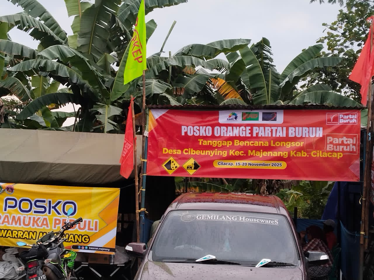 Eksekutif Partai Buruh Kabupaten Cilacap bersama Organisasi Inisiator Partai Buruh KSPI, KEP dan FSPMI mendirikan Posko Orange Partai Buruh Siaga dan Tanggap Bencana di Desa Cibeunying Kecamatan Majenang Kabupaten Cilacap 18 November 2025.