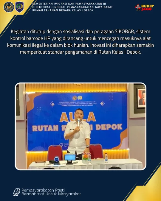 Kegiatan ditutup dengan sosialisasi dan peragaan SIKOBAR, sistem kontrol barcode HP yang dirancang untuk mencegah masuknya alat komunikasi ilegal ke dalam blok hunian. Inovasi ini diharapkan semakin memperkuat standar pengamanan di Rutan Kelas I Depok.