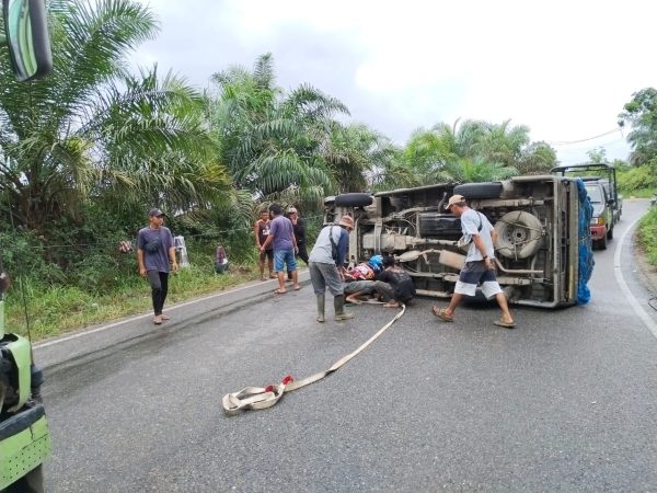 KUANSING — Kecelakaan tunggal terjadi di Jalan Lintas Teluk Kuantan–Rengat, Desa Sako, Kecamatan Pangean. Kecelakaan melibatkan satu unit mobil Mitsubishi L300 Pick Up yang membawa muatan durian, Minggu (7/12/2025) sekira pukul 10.30 WIB.