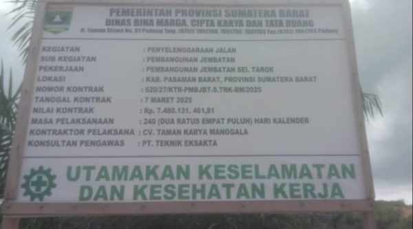 Seperti diketahui proyek jembatan Sei Tarok Jorong Ranah Penantian Poros ini merupakan proyek Dinas Bina Marga, Cipta Karya dan Tata Ruang (BMCKTR) Provinsi Sumbar yang dilaksanakan oleh CV Taman Karya Manggala.