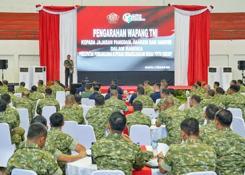 Jakarta (Puspen TNI). Wakil Panglima TNI Jenderal TNI Tandyo Budi R memberikan pengarahan kepada jajaran Pangdam, Danrem, dan Dandim dalam rangka percepatan pembangunan Koperasi Desa/Kelurahan Merah Putih (KDKMP), bertempat di GOR Nanggala Kopassus, Cijantung, Jakarta Timur, Selasa (3/2/2026). Pengarahan tersebut menekankan soliditas, fokus kinerja, dan integritas jajaran TNI dalam mendukung program strategis nasional Presiden Republik Indonesia.