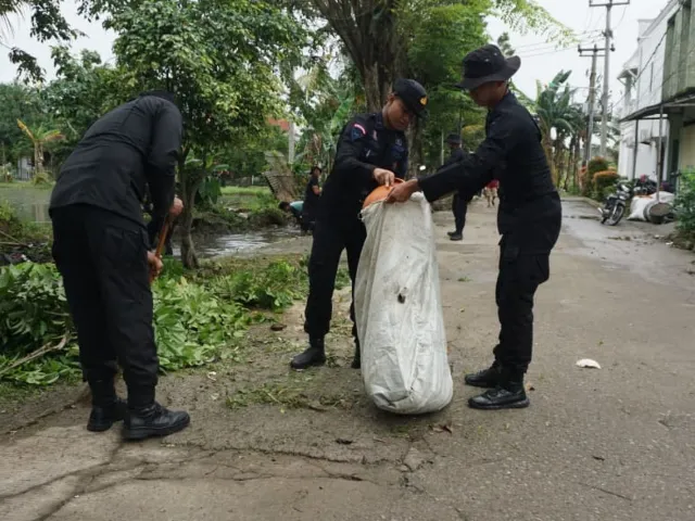 Kegiatan yang dimulai sejak pukul 07.00 WIB itu menyasar pembersihan jalan lingkungan, selokan, serta penataan pohon-pohon yang berpotensi mengganggu jaringan kabel listrik. Sebanyak 30 personel Brimob diterjunkan dan bersinergi bersama masyarakat untuk mengumpulkan serta membuang sampah ke tempat pembuangan yang telah disiapkan.