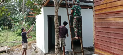 Morotai, Maluku Utara – Personel TMMD Ke-127 Kodim 1514/Morotai bersama masyarakat melaksanakan pengecatan MCK di Desa Dehegila, Kecamatan Morotai Selatan, pada Kamis (5/3/2026). Pengecatan dilakukan untuk memperindah sekaligus menjaga ketahanan bangunan MCK agar lebih nyaman dan bersih saat digunakan.