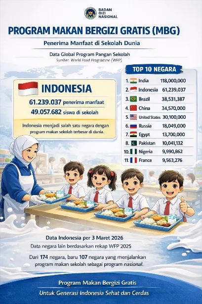 Jakarta β Program Makan Bergizi Gratis (MBG) yang dijalankan pemerintah melalui Badan Gizi Nasional (BGN) menempatkan Indonesia sebagai salah satu negara dengan program makan sekolah terbesar di dunia. Berdasarkan data yang dirilis per 3 Maret 2026, jumlah penerima manfaat program ini telah mencapai 61.239.037 orang, dengan 49.057.682 di antaranya merupakan siswa sekolah.