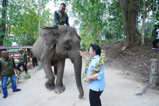 Jenderal Sigit bersama Titiek Soeharto, Menhut Raja Juli Antoni dan rombongan tiba di TNTN, Kabupaten Pelalawan, Selasa (17/3/2026). Kehadiran mereka disambut dengan atraksi unik berupa pengalungan bunga oleh salah satu gajah binaan TNTN kepada Titiek Soeharto.