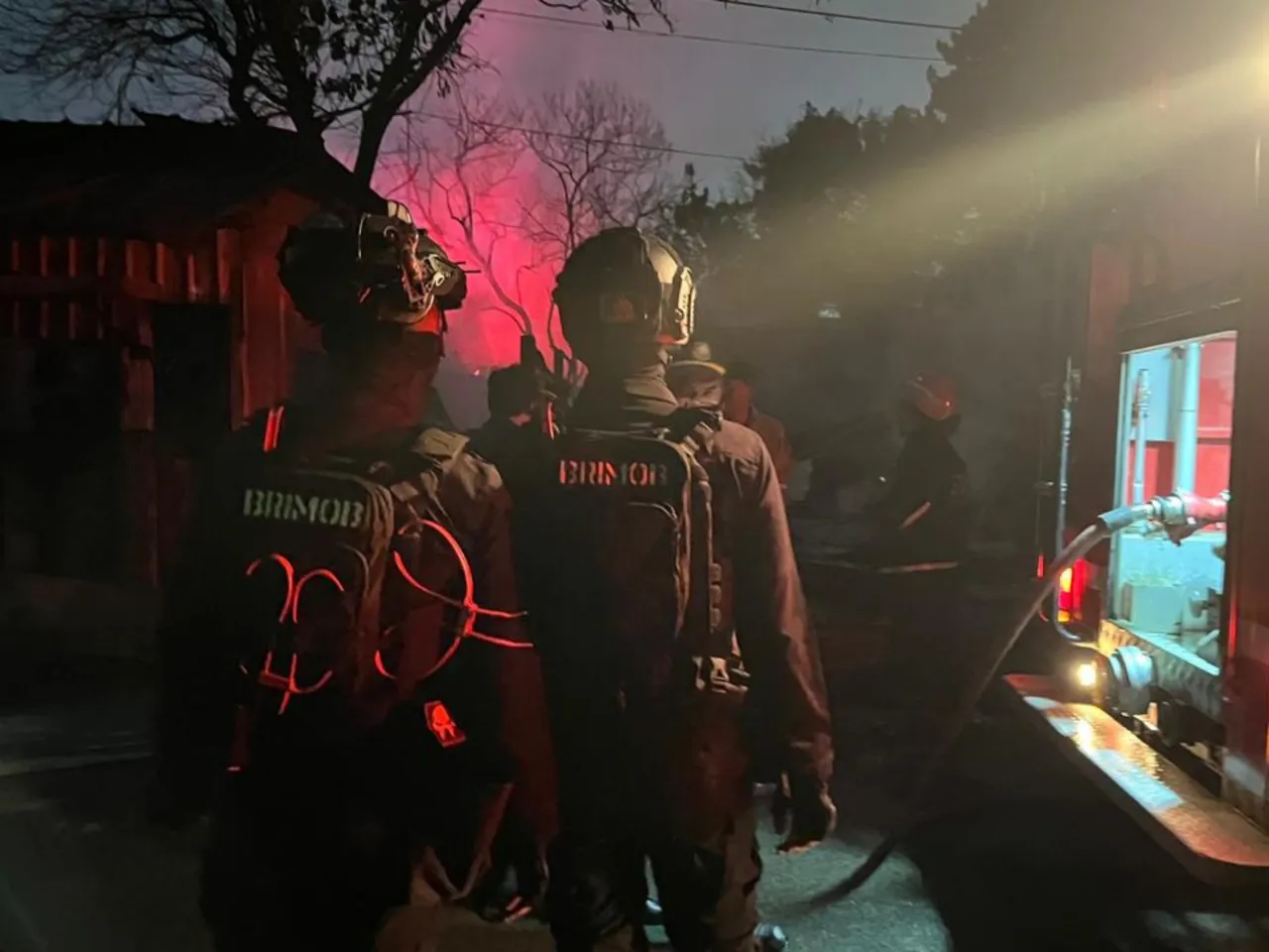Bekasi – Personel Batalyon D Pelopor Satuan Brimob Polda Metro Jaya bergerak cepat melakukan pengamanan dan penanganan kebakaran di area SPBE PT Indogas Andalan Kita, Cimuning, Mustika Jaya, Kota Bekasi, Kamis dini hari (2/4/2026). Kebakaran di fasilitas gas elpiji tersebut berhasil dikendalikan oleh petugas pemadam kebakaran, sementara aparat memastikan kondisi tetap aman bagi masyarakat sekitar.