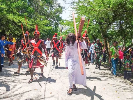 Timika – Babinsa Koramil 1710-07/Mapurujaya, Sertu Yulius Nampe, melaksanakan pengamanan kegiatan ibadah dan prosesi jalan salib yang berlangsung di Distrik Mimika Timur, Jumat (3/4/2026). Kegiatan jalan salib tersebut diikuti oleh masyarakat setempat sebagai bagian dari rangkaian peringatan keagamaan. Prosesi dilaksanakan dengan berjalan kaki menyusuri rute dari Kampung Muare menuju Kampung Kaugapu sambil membawa simbol-simbol keagamaan.