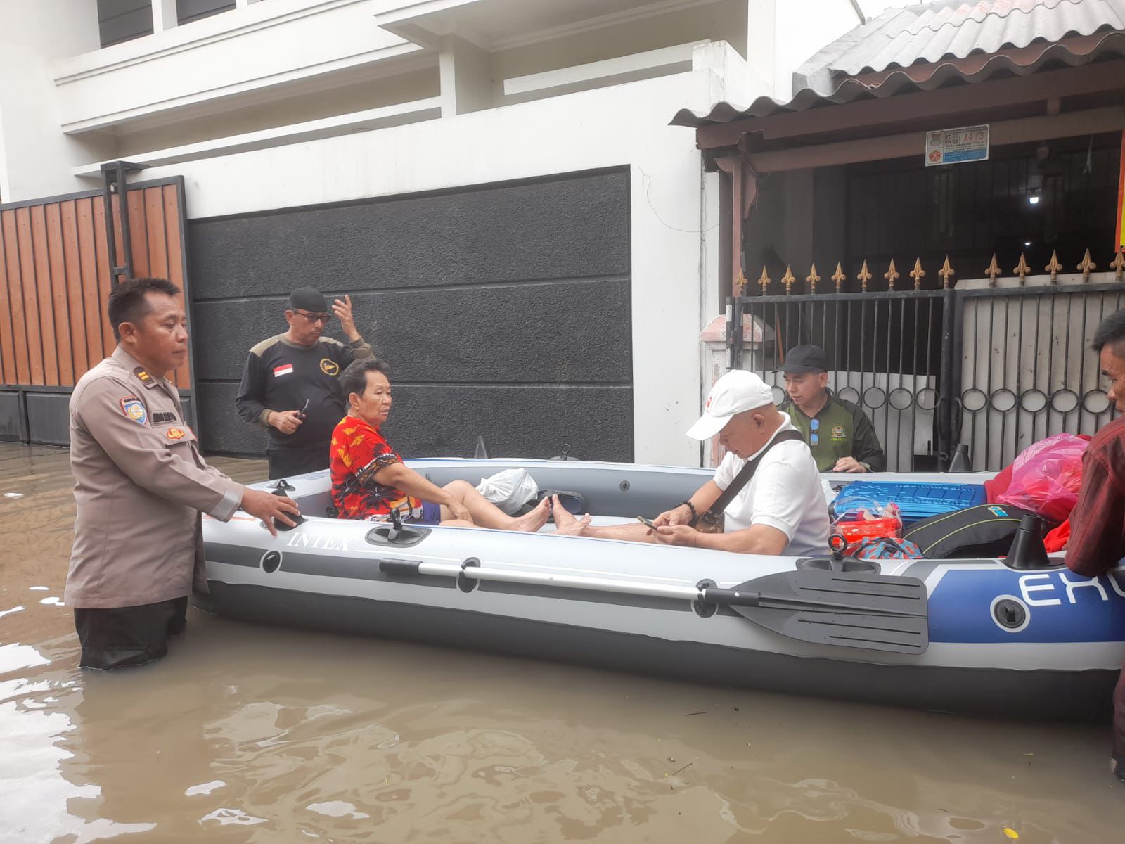 Potret Polri Tanggap Bencana, Personel Polsek Cengkareng Bahu Membahu Evakuasi Warga Di Perum Taman Kencana