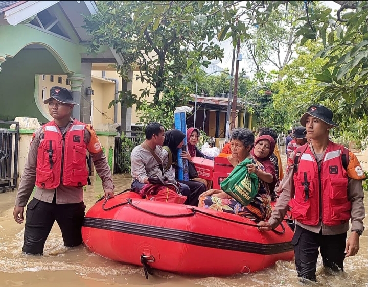 Personil Polres Metro Tangerang Kota dan Warga Bersama Evakuasi Korban Banjir di Desa Jati Mulya