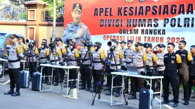 JAKARTA – Kadiv Humas Polri Irjen Pol Sandi Nugroho memimpin upacara gelar pasukan Kesiapsiagaan Ops…